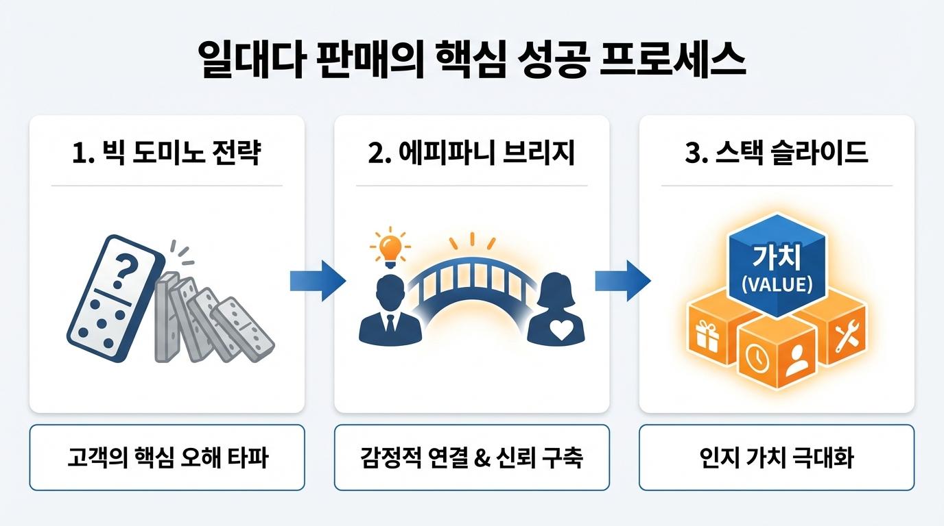 제안의 요소들이 하나둘씩 쌓여가는 모습을 시각적으로 확인하며 고객은 '이 제안을 거절하는 것이 오히려 손해'라는 확신을 갖게 됩니다. 가격에 대한 저항을 없애고 가치에 집중하게 만드는 이 과정이 10배 이상의 수익 차이를 만듭니다.