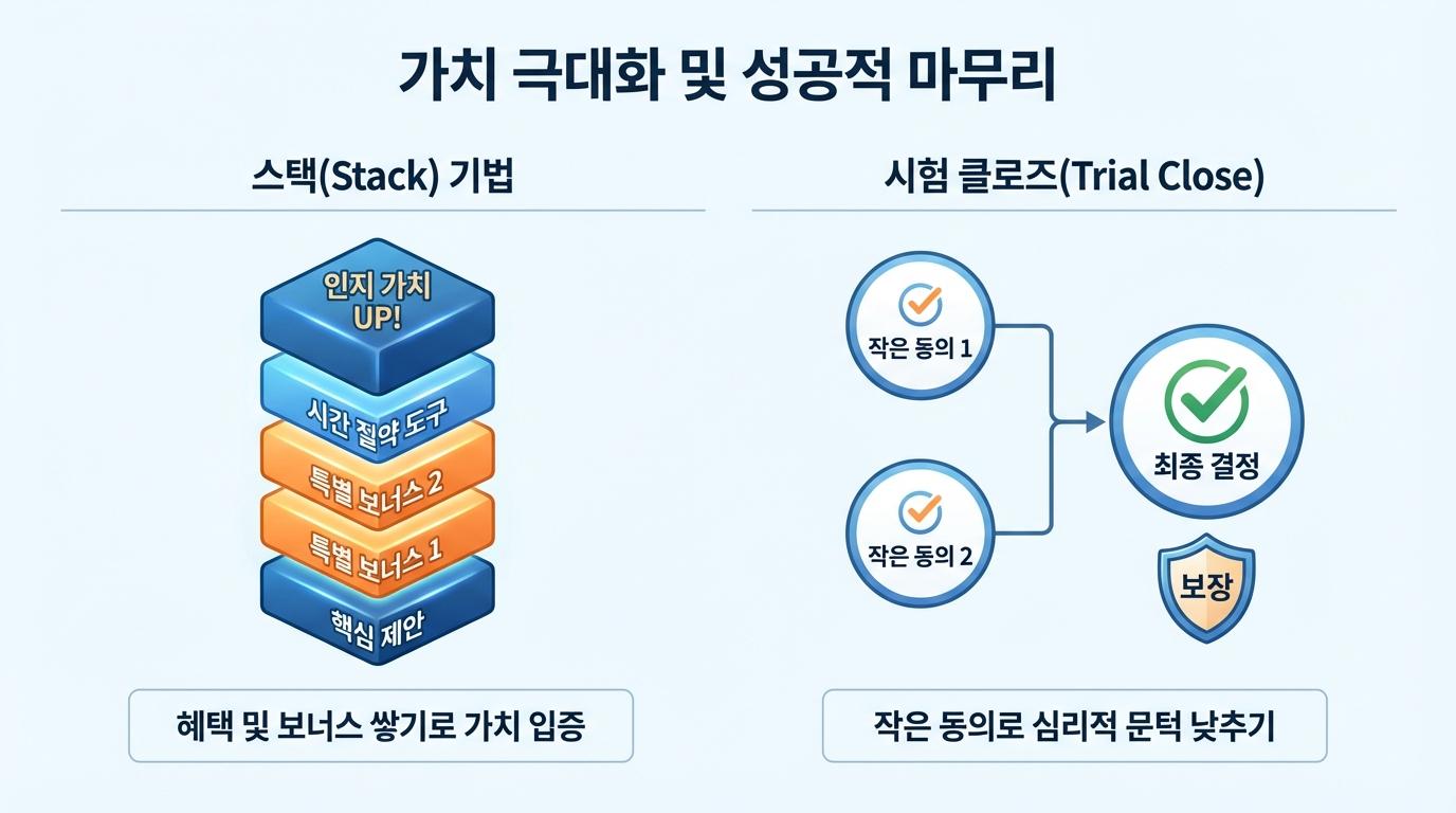 최종 결정을 앞둔 고객은 본능적으로 주춤거리기 마련입니다. 이때 사소한 동의를 끌어내는 질문들을 던져보세요. "이해가 되시나요?", "정말 신나지 않습니까?"와 같은 가벼운 질문에 고객이 고개를 끄덕이게 만드는 과정이 시험 클로즈입니다. 작은 '예'가 쌓여 큰 결정을 내리는 심리적 문턱이 낮아지는 것이죠.