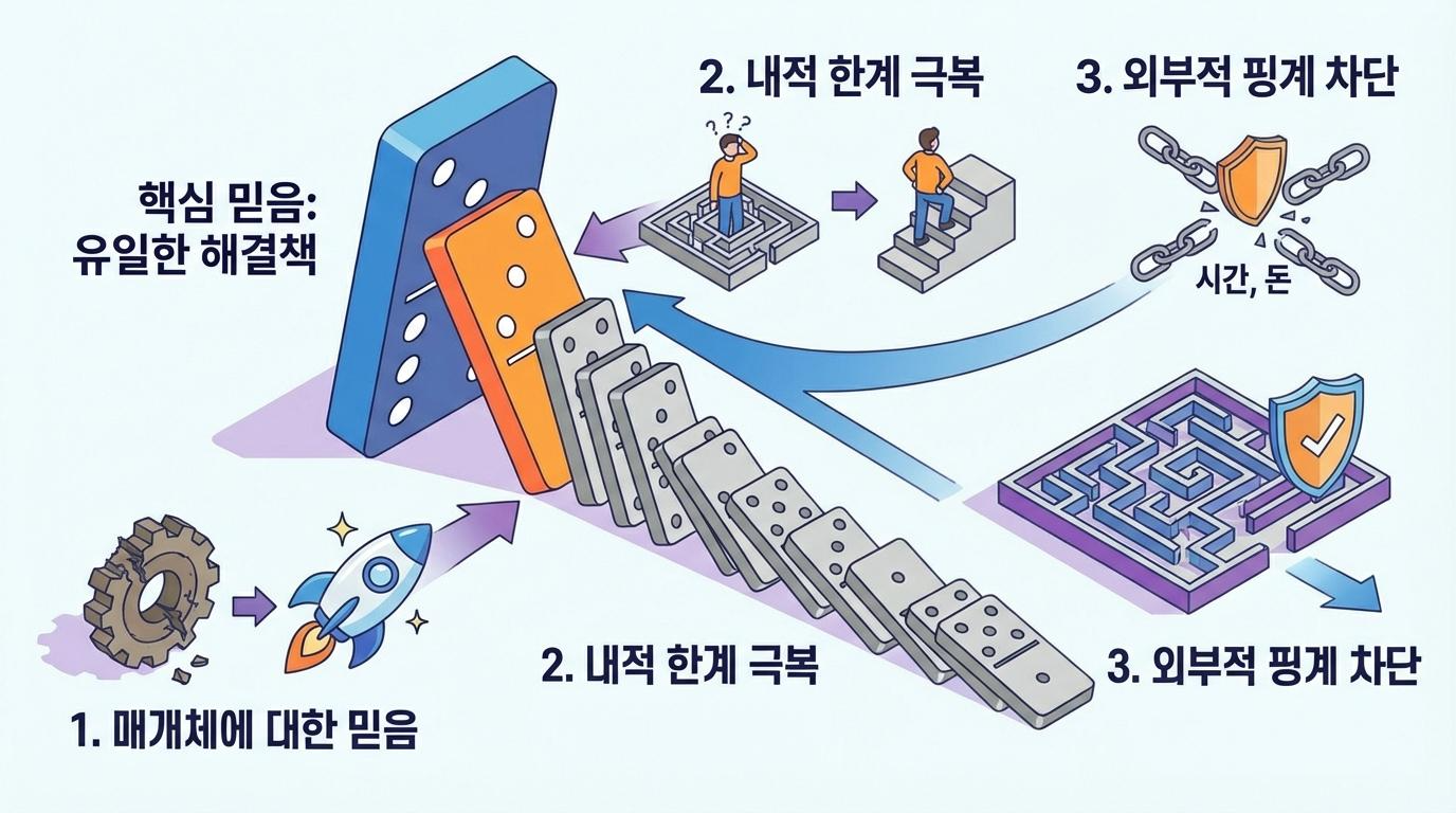 매개체가 훌륭하다는 것을 인정하더라도 고객은 "이게 좋은 건 알겠는데, 과연 내가 해낼 수 있을까?"라는 스스로에 대한 의구심을 품습니다. 이것이 바로 내적 믿음의 장애물입니다. 이를 해결하기 위해 당신은 기술적인 전문 지식이 없어도, 혹은 특별한 재능이 없어도 이 프레임워크를 통해 충분히 성공할 수 있음을 증명해야 합니다.