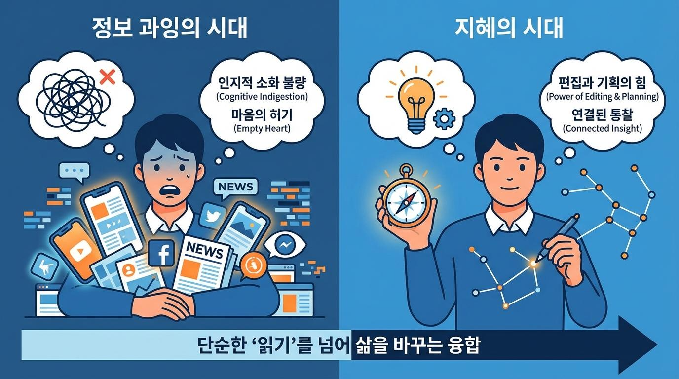 우리는 아침에 눈을 뜨자마자 스마트폰을 켜고 무한한 스크롤의 늪에 빠져듭니다. 수많은 뉴스, SNS 포스팅, 파편화된 데이터들이 뇌 속으로 밀려 들어오지요. 하지만 잠들기 전 오늘 무엇을 배웠는지 떠올려보면 머릿속이 하얘지는 경험을 자주 하곤 합니다. 이것은 지식이 부족해서가 아니라, 정보가 너무 많아 발생하는 인지적 소화 불량 상태에 빠졌기 때문입니다. 대중은 복잡한 세상을 해석할 수 있는 명쾌한 도구를 원하면서도, 그것을 얻기 위해 과도한 에너지를 쓰는 것은 기피하는 경향이 있습니다. 결국 우리에게 필요한 것은 더 많은 정보가 아니라, 흩어진 점들을 연결해 하나의 선으로 만들어주는 편집과 기획의 힘입니다.