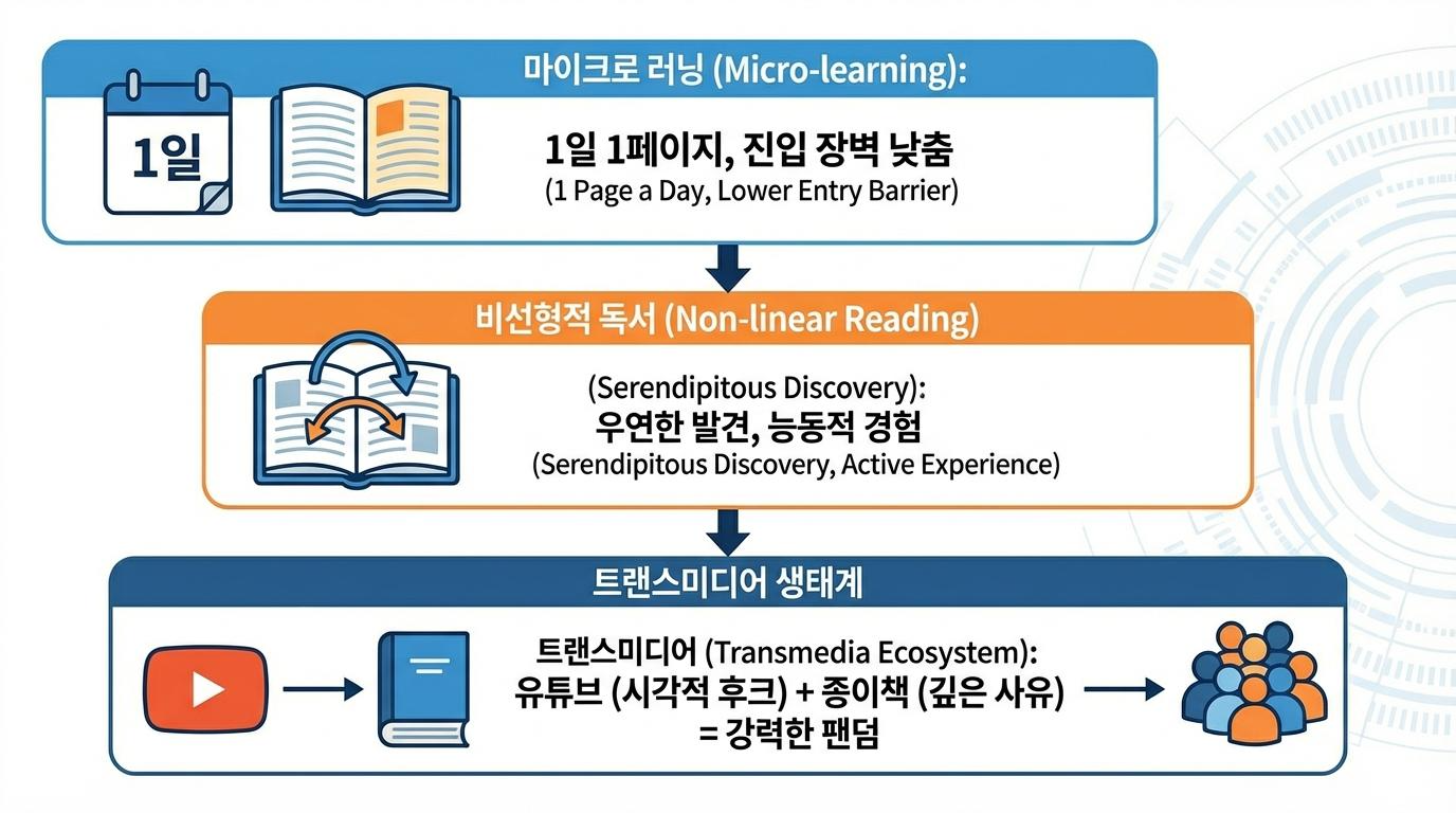 성공적인 콘텐츠의 비결 중 하나는 진입 장벽을 낮추는 것입니다. '1일 1페이지'라는 직관적인 형식은 바쁜 현대인들에게 최소한의 노력으로 최대의 지적 효능감을 줍니다. 하지만 단순히 요일별로 주제를 나누는 기계적인 방식은 사고의 흐름을 끊을 수 있다는 단점이 있지요. 이를 극복하기 위해 제안하는 방식이 바로 비선형적 독서입니다. 책의 아무 페이지나 무작위로 펼쳐 읽어도 독립적인 깨달음을 얻을 수 있게 구성하되, 하이퍼링크처럼 관련된 다른 페이지로 꼬리에 꼬리를 물고 이어지게 만드는 것입니다. 이러한 '우연의 미학'은 독자에게 강제된 학습이 아닌, 스스로 지식의 지도를 그려나가는 능동적이고 짜릿한 경험을 선사합니다.