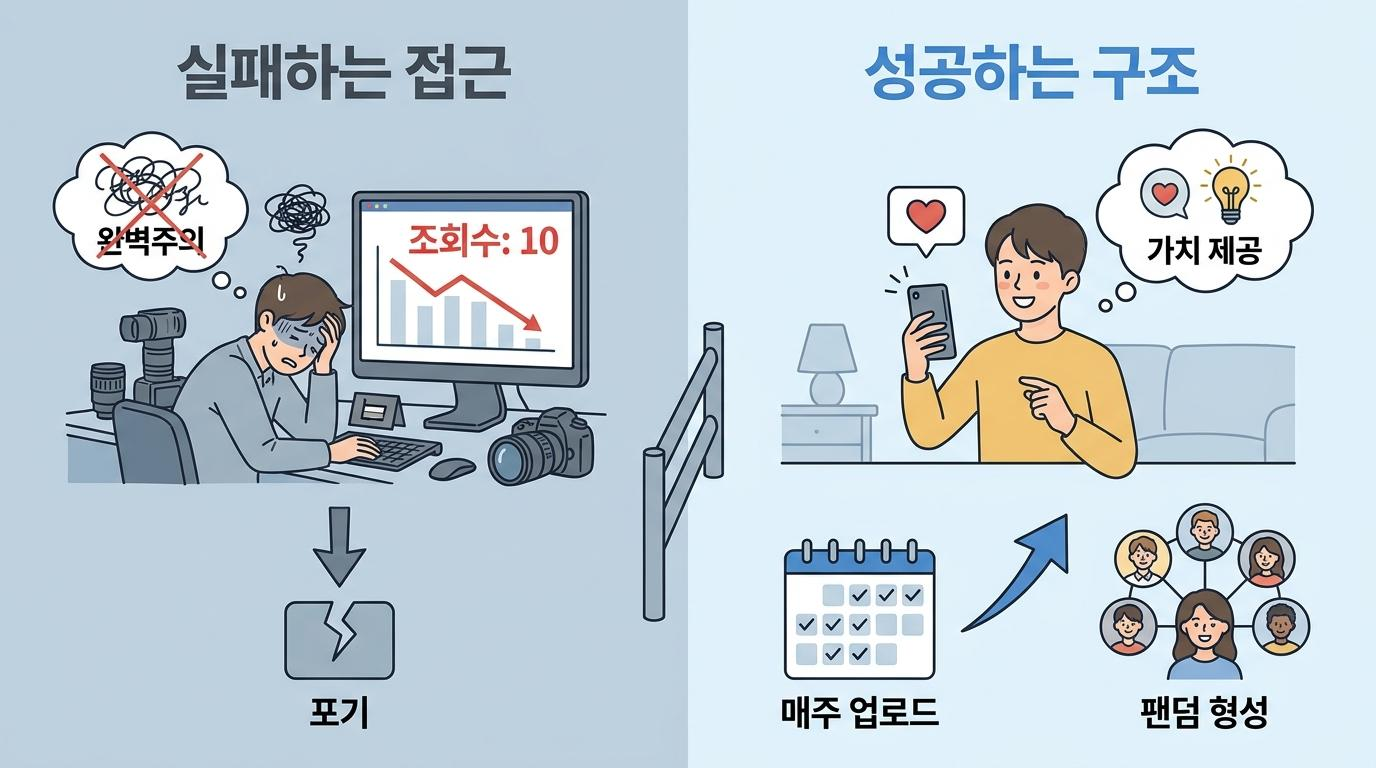 다만 꾸준함을 유지하려면 콘텐츠 주제와 형식이 스스로에게 의미 있어야 합니다. 싫어하는 일을 오랫동안 지속하는 사람은 드뭅니다. 보상이 없어도 계속할 수 있을 만큼 흥미롭고, 본인이 실제로 가치 있다고 느끼는 주제를 선택하십시오. 열정이 끈기를 지속시키는 연료입니다. 목표는 고집하되, 방법에는 유연해야 합니다. 영상 하나가 기대에 못 미쳤다면 다음 영상에서 배우고 조정하면 됩니다. 3개월간 성장이 보이지 않는다면 데이터를 분석하고 접근법을 수정하되, 포기는 선택지에 넣지 마십시오.