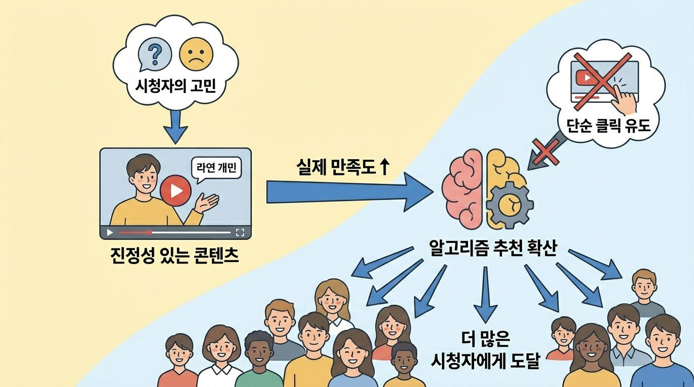콘텐츠를 만들 때 가장 먼저 던져야 할 질문은 "이 영상이 누구의 어떤 문제를 해결하는가"입니다. 유튜브 알고리즘은 이미 이 방향으로 깊이 진화해 있습니다. 2025년 현재 유튜브의 추천 시스템은 단순히 클릭 수나 조회 시간만을 보는 것이 아니라, 시청자가 실제로 만족감을 느꼈는지를 복합적인 데이터로 평가하고, 이를 추천에 반영하고 있습니다. 플랫폼이 측정하는 것은 더 이상 단순한 체류 시간이 아니라 '이 콘텐츠가 시청자의 삶에 가치를 주었는가'에 가깝습니다.