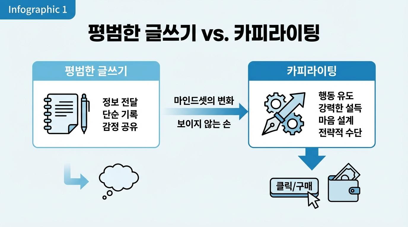 평범한 글쓰기가 정보의 전달이나 감정의 공유를 목적으로 한다면, 카피라이팅은 철저히 독자의 행동을 이끌어내기 위한 전략적 수단입니다. 단순히 정보를 나열하는 데 그치지 않고, 독자가 링크를 클릭하거나 구매 버튼을 누르게 만드는 구체적인 목표를 가집니다. 이러한 차이는 글을 대하는 태도, 즉 마인드셋의 변화에서 시작됩니다.