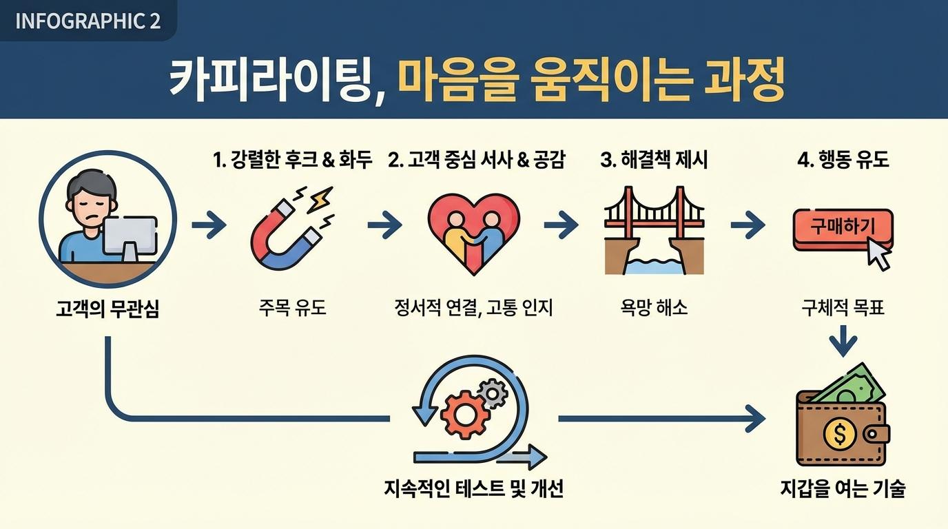 이후에 뒤따르는 논리적인 근거와 통계 자료들은 사실 고객이 자신의 감정적 선택을 정당화하기 위한 도구로 사용됩니다. 따라서 성공적인 카피는 강력한 감정적 자극으로 시작하여, 흔들리지 않는 신뢰의 증거들로 마침표를 찍어야 합니다. 공감을 얻지 못한 논리는 차가운 데이터에 불과하지만, 감정이 실린 논리는 거부할 수 없는 제안이 됩니다.