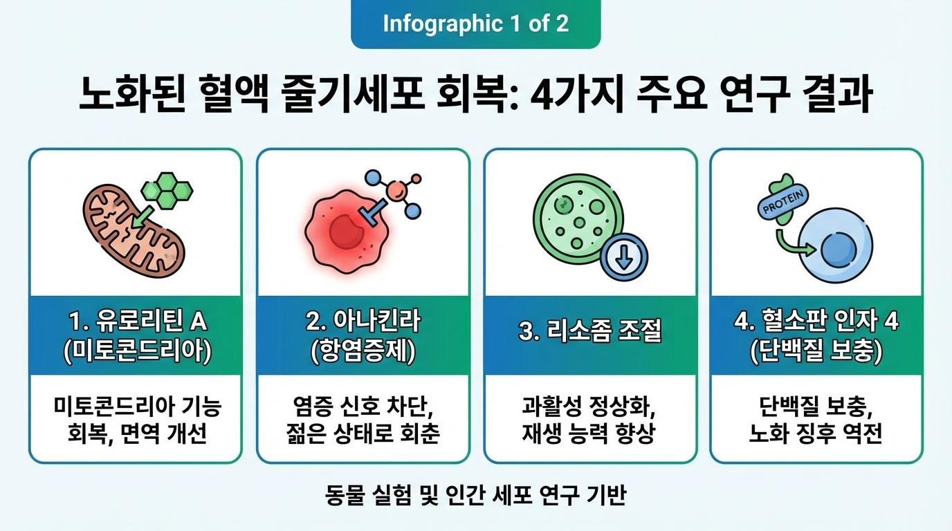 이 유로리틴 A는 마치 숙련된 정비공처럼, 세포 안의 고장 난 미토콘드리아를 식별하고 깔끔하게 청소(자가포식)하는 역할을 합니다. 낡고 비효율적인 발전소를 제거하고 새로운 발전소가 잘 돌아갈 수 있는 환경을 만들어주는 셈입니다. 실제 늙은 쥐에게 이 물질을 공급하자, 혈액 줄기세포의 기능이 눈에 띄게 향상되었고 바이러스에 맞서는 면역 반응도 훨씬 강력해졌습니다. 이는 우리가 먹는 음식을 통해 혈액 시스템의 노화를 늦추거나 되돌릴 수 있다는 흥미로운 가능성을 제시합니다.
