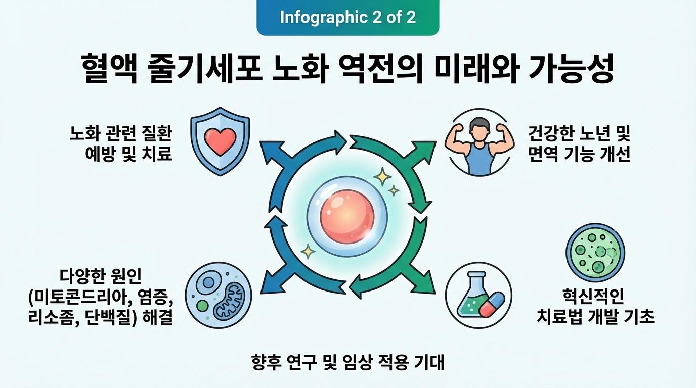 가설을 증명하기 위해 늙은 쥐에게 이 단백질을 다시 보충해주었습니다. 그 결과는 매우 극적이었습니다. 혈액 줄기세포에서 나타나던 노화의 여러 징후들이 역전되었고, 새로 만들어지는 면역 세포와 혈액 세포들이 마치 젊은 쥐의 것처럼 건강해졌습니다. 이는 마치 복잡한 기계에서 핵심 나사 하나를 찾아 끼웠을 때 기계 전체가 다시 원활하게 작동하는 것과 같습니다. 이 단백질은 앞으로 노화된 혈액 시스템을 개선하는 유망한 치료 목표가 될 수 있습니다.