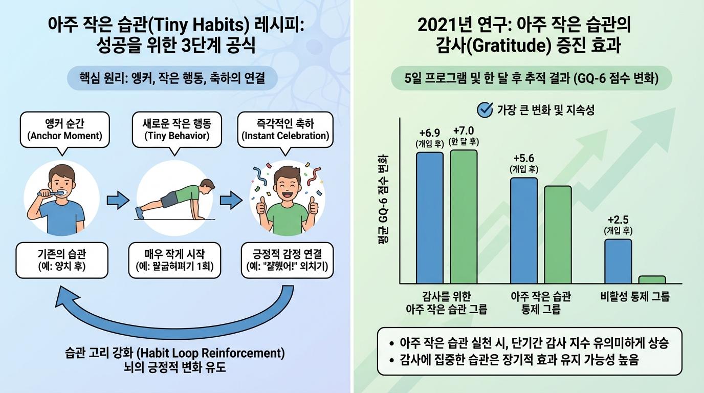 이러한 원리가 단순한 이론에 그치지 않는다는 사실은 실제 연구를 통해 증명되었습니다. 한 연구에서는 참가자들을 여러 그룹으로 나누어 5일 동안 아주 작은 습관을 실천하게 했습니다. 특히 한 그룹은 '아침에 일어나면 감사한 일 한 가지 떠올리기'처럼 감사함을 키우는 아주 작은 습관에 집중했습니다.