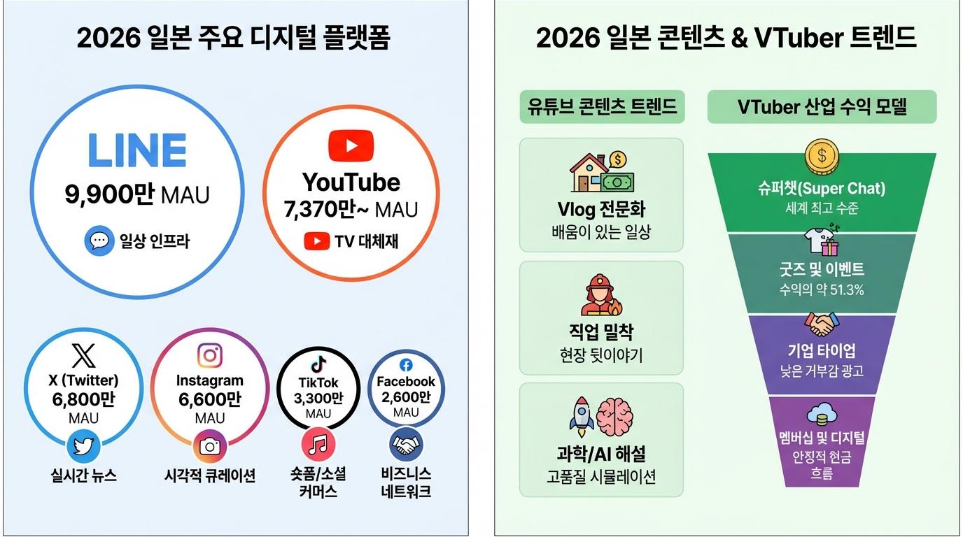 일본의 SNS 시장은 라인(LINE)의 독점적 지위 아래 유튜브(YouTube), X(구 트위터), 인스타그램(Instagram), 틱톡(TikTok)이 각기 다른 기능적 역할을 수행하며 상호 보완적인 네트워크를 형성하고 있다. 2024년 말부터 2025년 사이 소셜 미디어 사용자 정체성은 약 200만 명($+2.1\%$) 증가하였으며, 특히 18세 이상 인구의 89.2%가 SNS를 이용하고 있다는 점은 시장의 성숙도를 방증한다.