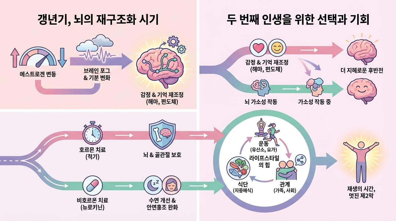 에스트로겐 수용체 $ER\alpha$는 해마의 시냅스 가소성 유지와 신경 발생에 필수적입니다. 폐경 후 에스트로겐 결핍은 해마의 신경 세포 연결성을 약화시켜 기억력 감퇴와 학습 능력 저하를 유발할 뿐만 아니라, 감정 조절 능력을 저하시켜 우울증의 신경학적 기반을 형성합니다. 전두엽 피질에서의 호르몬 감소는 실행 기능과 작업 기억의 손상으로 이어지며, 이는 임상적으로 '브레인 포그'라 불리는 인지적 혼란 상태를 초래합니다.