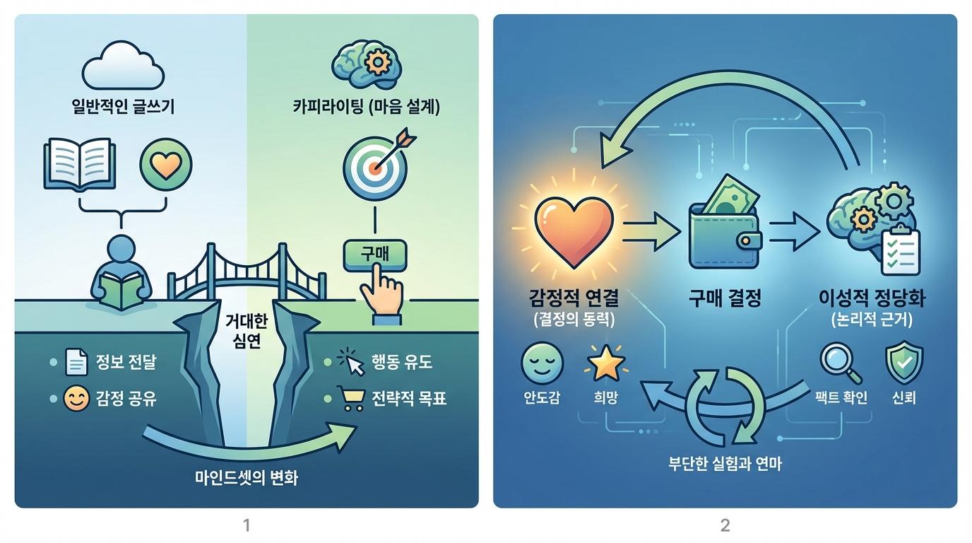 이후에 뒤따르는 논리적인 근거들은 사실 고객이 자신의 감정적 선택을 정당화하기 위한 도구로 사용됩니다. 따라서 성공적인 카피는 강력한 감정적 자극으로 시작하여, 행동을 유도하는 명확한 제안으로 마침표를 찍어야 합니다. 공감을 얻지 못한 글은 단순한 텍스트에 불과하지만, 감정이 실린 카피는 삶을 바꾸는 강력한 세일즈맨이 됩니다.