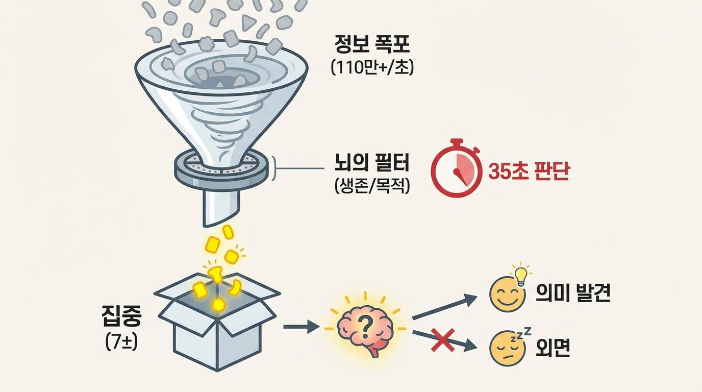 우리의 뇌는 매 초당 110만 개가 넘는 방대한 정보를 감각기관을 통해 받아들입니다. 하지만 이 모든 정보를 동시에 처리할 수는 없기에, 뇌는 생존과 직접적으로 관련된, 혹은 현재의 목적에 가장 중요한 정보만을 선별하여 집중합니다. 실제로 우리가 의식적으로 집중할 수 있는 정보는 고작 일곱 개 내외에 불과하지요. 독자의 뇌는 자신이 읽는 글이 자신의 삶에 어떤 의미가 있는지 35초 안에 판단하지 못하면 즉시 흥미를 잃어버립니다. 이는 뇌가 에너지를 절약하고, 중요한 것에 집중하기 위한 본능적인 메커니즘입니다. 따라서 독자가 알 필요 없는 배경 설명이나 장황한 묘사는 독자의 뇌를 지루하게 만들고, 결국 그 글에서 멀어지게 만드는 원인이 됩니다.