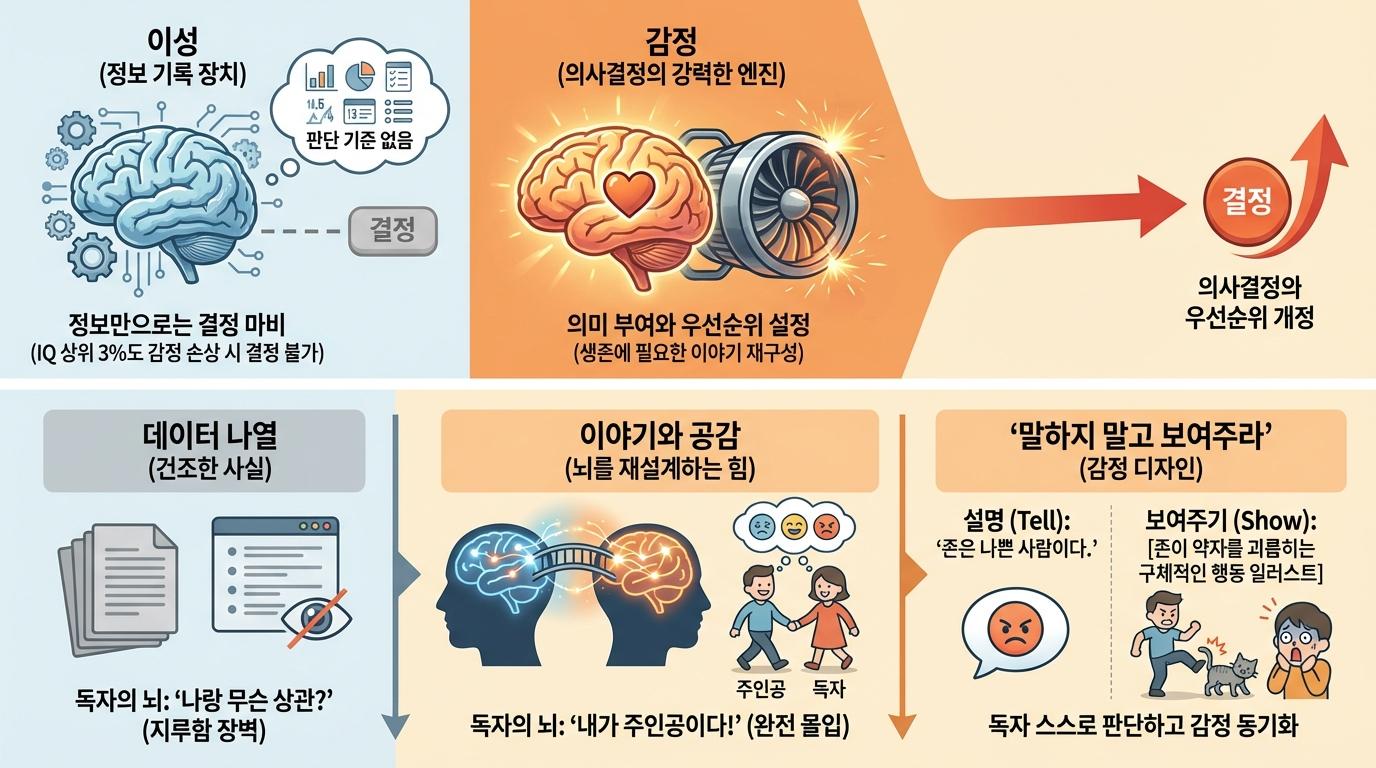 우리는 흔히 이성과 감정을 정반대의 개념으로 생각하곤 합니다. 하지만 신경과학의 발견은 놀랍습니다. 뇌 손상으로 감정을 느끼지 못하게 된 사람들은 지능지수가 상위 3%에 달해도 결정을 내리지 못하게 됩니다. 어떤 펜을 쓸지 같은 사소한 일부터 업무의 우선순위를 정하는 일까지, 모든 판단 기준이 사라지기 때문입니다. 독자에게도 마찬가지입니다. 당신의 글에서 감정적인 무게를 느끼지 못한다면, 그 글은 독자에게 아무런 의미도 갖지 못하며 결국 지루함이라는 장벽에 막히게 됩니다. 독자를 움직이게 하고 싶다면, 논리적인 설명보다 먼저 그들이 느끼게 만들어야 합니다. 감정은 선택이 아니라 의사결정의 강력한 엔진으로 작동합니다.