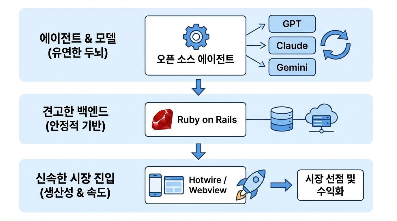 에이전트가 코드를 대신 짜주는 시대가 되었지만, 그 코드가 돌아갈 집을 짓는 일은 여전히 인간의 설계 능력을 필요로 합니다. 수많은 프레임워크를 경험한 끝에 내린 결론은 다시 루비 온 레일즈(Ruby on Rails)로의 회귀입니다. 복잡한 의존성 설정과 업데이트에 시간을 쏟는 것은 창작자에게 큰 비용이자 장애물입니다. 모델을 만들고 컨트롤러로 서빙하며 보안을 구성하여 클라우드에 올리는 과정이 가장 매끄러운 도구를 선택하는 것이 효율적입니다.